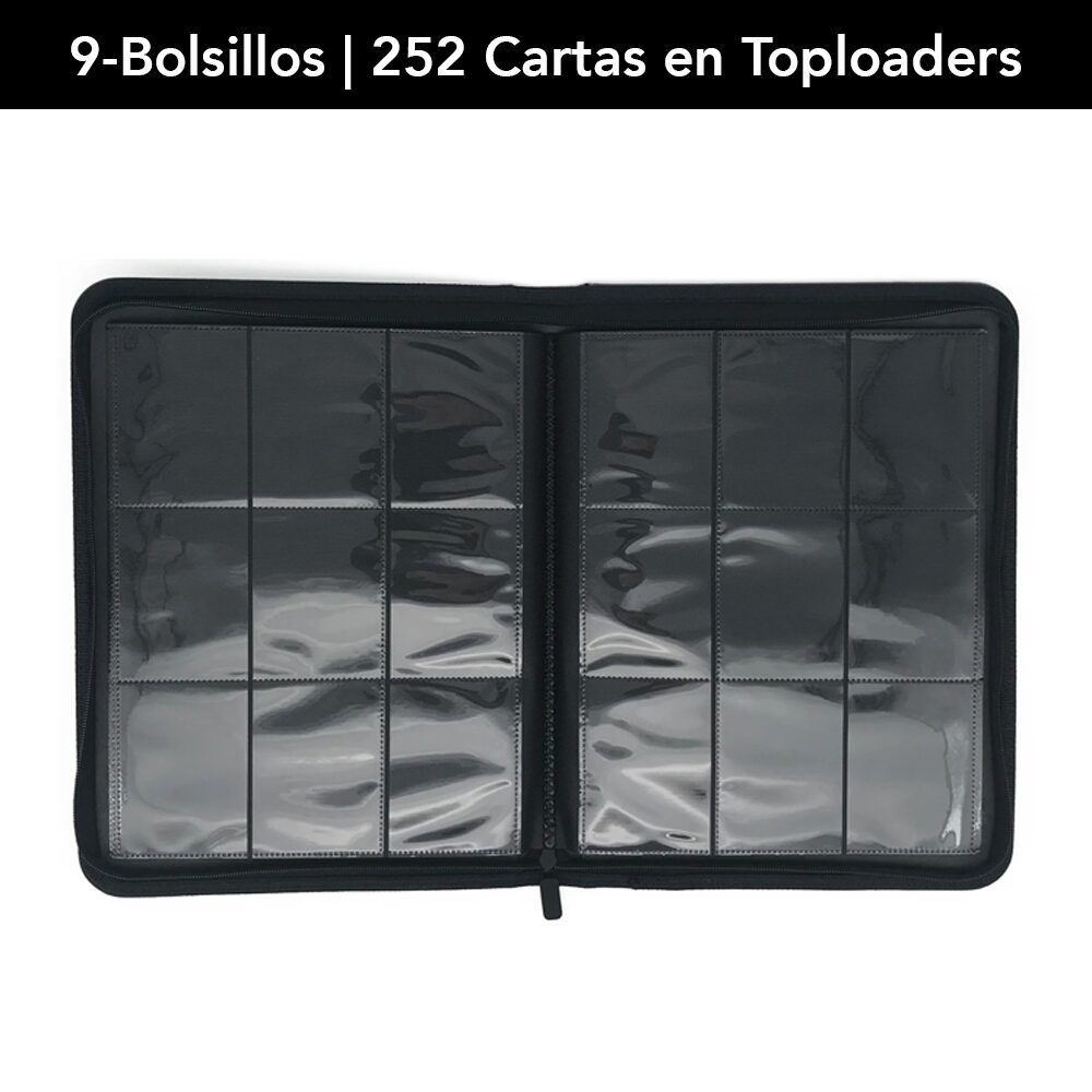 - Formato de 9 bolsillos (3×3), con espacio para hasta 252 cartas en toploaders, ideal para quienes buscan alta capacidad sin perder portabilidad.
